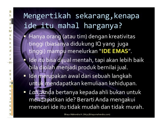 Salah satu kunci kesuksesan memulai suatu usaha adalah adanya kemampuan menuangkan ide atau gagasan cemerlang yang kreatif dan inovatif dan mempunyai nilai ekonomi tinggi banyak orang mengatakan bahwa ide atau gagasan mahal harganya. Sehat itu mahal harganya. Alhamdulillah yah sesuatu banget ini bukan mau membahas gaya bicara artis yang sedang naik pohon itu tapi memang ungkapan syukur harus kita panjatkan setiap hari setiap detik setiap mata berkedip.